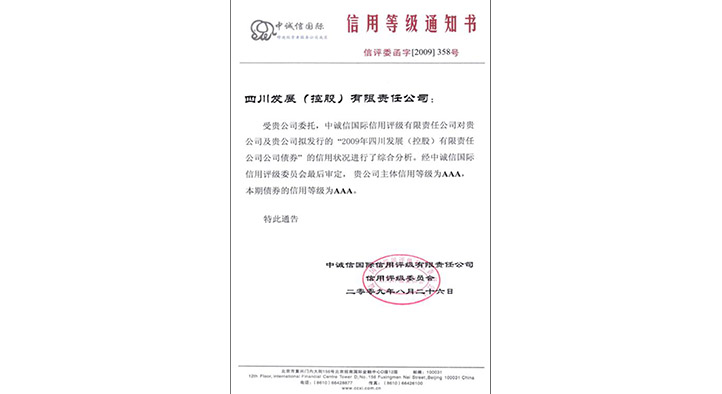 公司獲得中誠信國際信用評級公司高度認同,成為四川首家主體評級AAA級企業。